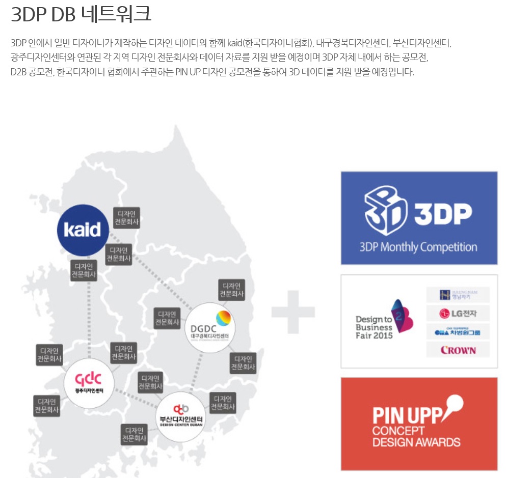 3DP´Â »ê¾÷Åë»óÀÚ¿øºÎÀÇ Áö¿øÀ» ¹Þ¾Æ ¿î¿µÇÏ´Â 3D printing D2B Ŭ¶ó¿ìµù ½Ã½ºÅÛÀ» ±â¹ÝÀ¸·ÎÇÑ À¥»çÀÌÆ® ¼Ò°³µå¸³´Ï´Ù.